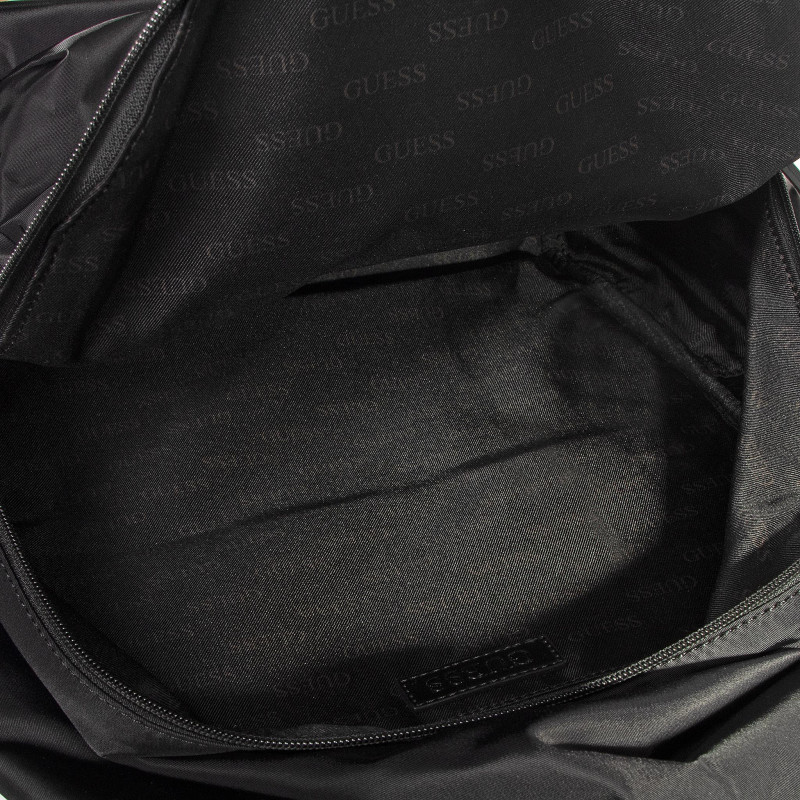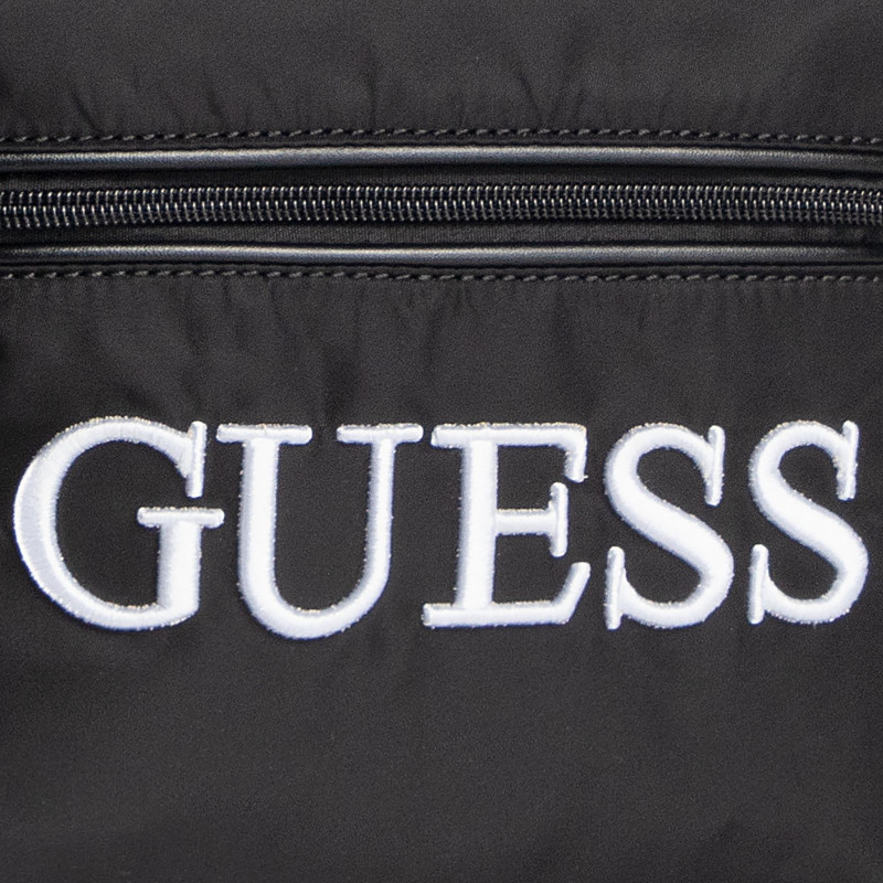Pánský černý batoh značky GUESS. Stylový batoh má 2 libovolně nastavitelné ramenní popruhy, jednu velkou a jednu menší kapsu obě uzavíratelné na zip a malou kapsu zdobí bílý nápis značky.