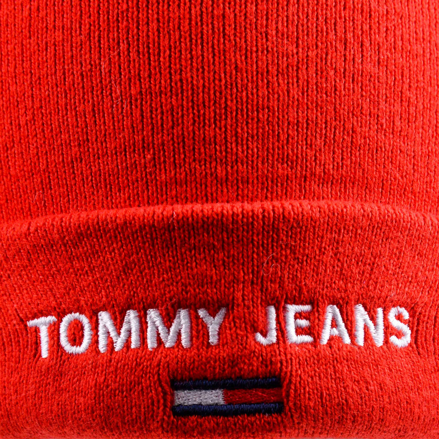 Dámská červená čepice značky Tommy Jeans. Čepice má ohrnutý okraj, který zdobí logo značky a nápis Tommy Jeans.