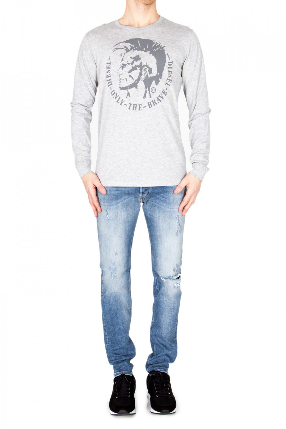 Pánské šedé tričko Diesel s dlouhým rukávem. Pánské tričko zdobí na hrudi černý potisk loga s kruhovým nápisem DIESEL - ONLY - THE - BRAVE - DIESEL. Módní tričko se perfektně hodí do města, práce i na zábavu.