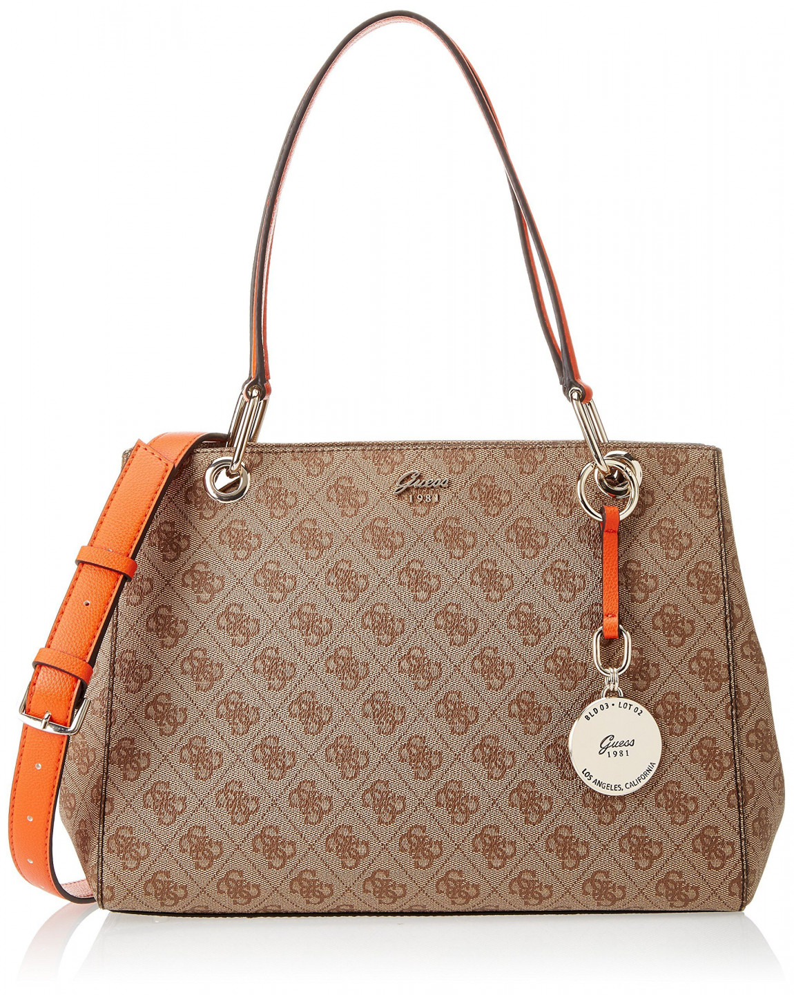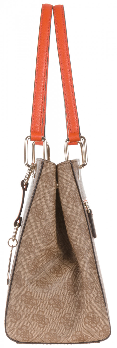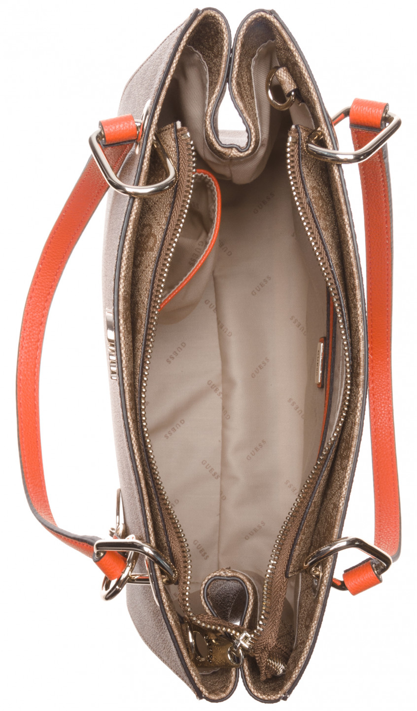 Elegantní hnědá kabelka GUESS přes rameno i do ruky ke všem příležitostem. Kabelka má uvnitř velkou přihrádku, 3 menší kapsy z toho 1 uzavíratelnou na zip. Kabelka se uzavírá pomocí zipu. na zadní straně kabelky se nachází 1 kapsa uzavíratelná pomocí zipu. Trendy kabelka má 1 oranžový odjímatelným libovolně nastavitelný ramenním popruh a 2 oranžové rukojeti. Po celé ploše zdobí kabelku hnědý motivy loga GUESS. Kabelku zdobí zlatý přívěšek s logem GUESS a na přední straně ji zdobí zlatý kovový nápis loga GUESS.