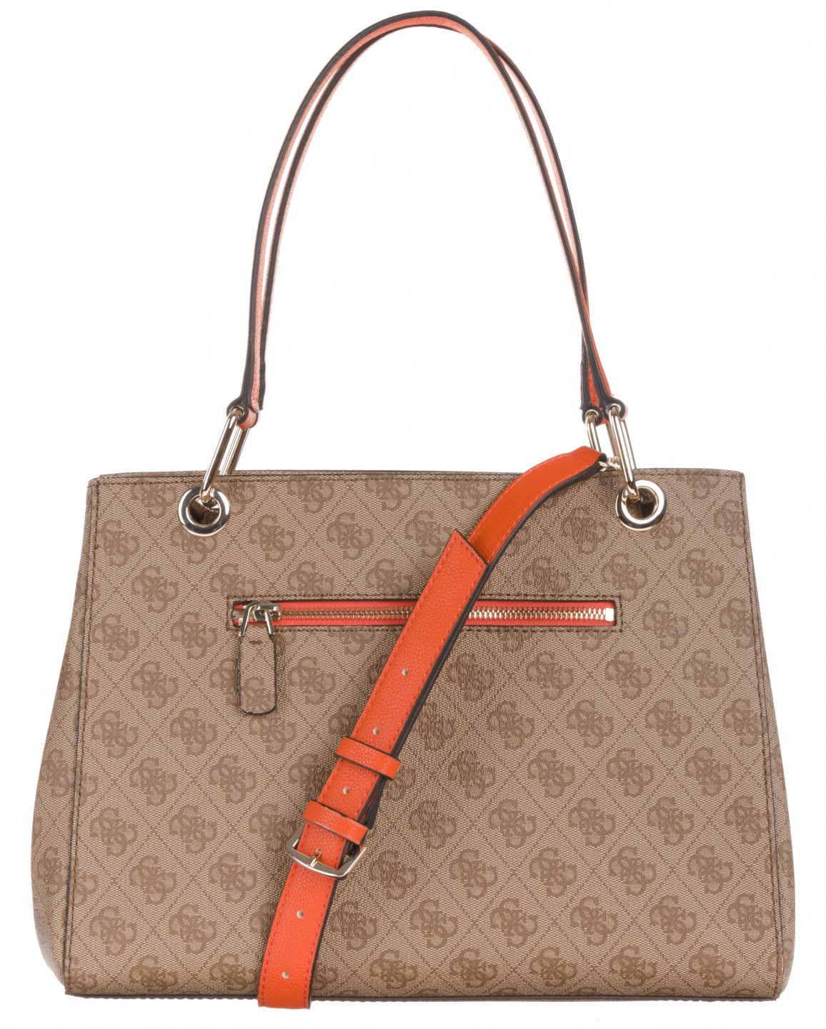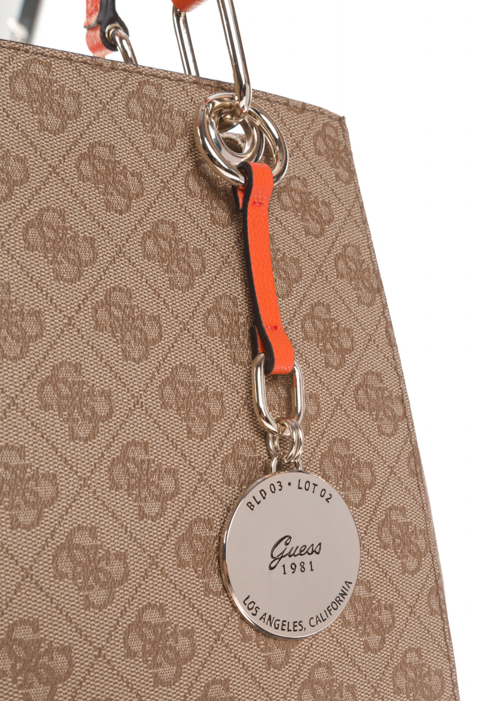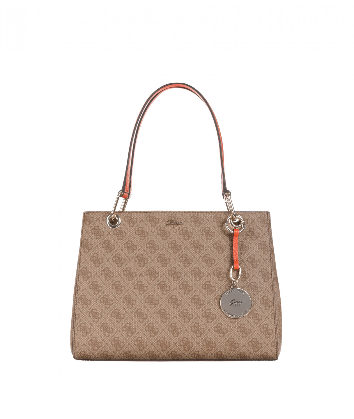 Elegantní hnědá kabelka GUESS přes rameno i do ruky ke všem příležitostem. Kabelka má uvnitř velkou přihrádku, 3 menší kapsy z toho 1 uzavíratelnou na zip. Kabelka se uzavírá pomocí zipu. na zadní straně kabelky se nachází 1 kapsa uzavíratelná pomocí zipu. Trendy kabelka má 1 oranžový odjímatelným libovolně nastavitelný ramenním popruh a 2 oranžové rukojeti. Po celé ploše zdobí kabelku hnědý motivy loga GUESS. Kabelku zdobí zlatý přívěšek s logem GUESS a na přední straně ji zdobí zlatý kovový nápis loga GUESS.