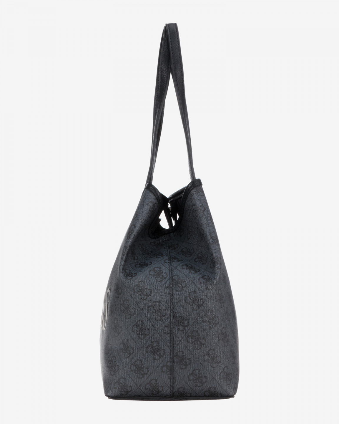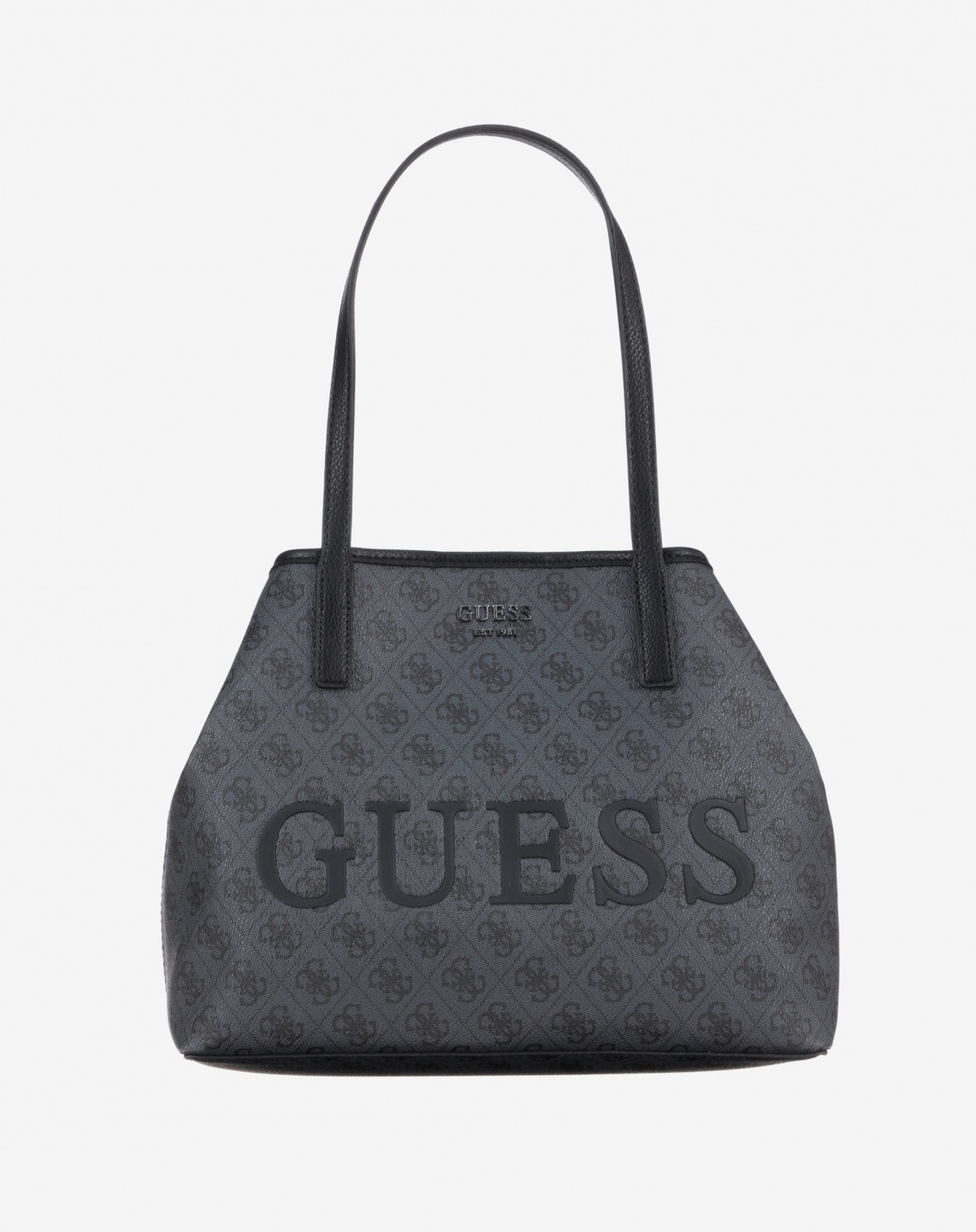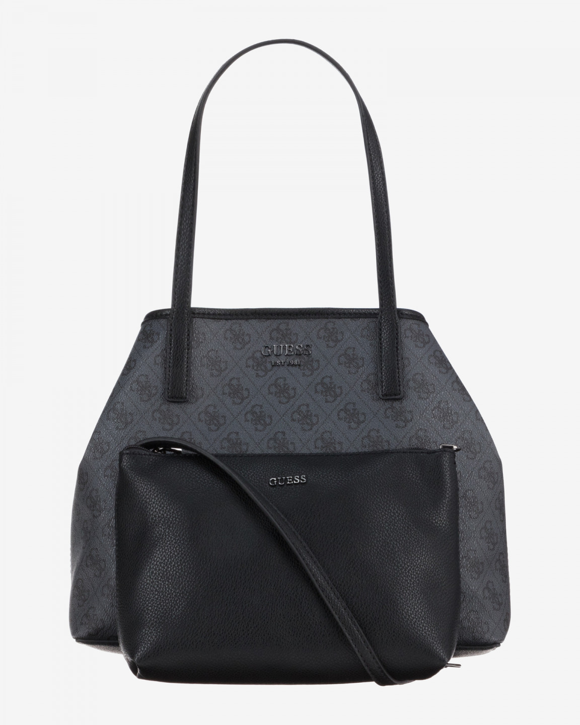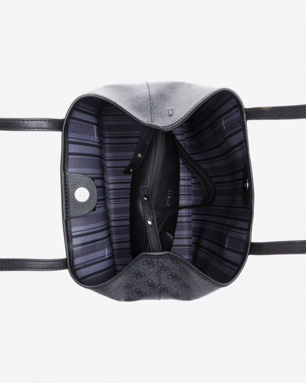 Elegantní černá kabelka značky GUESS ke všem příležitostem. Kabelku je možno nosit v ruce i přes rameno a uzavírá se pomocí magnetky. Je opatřena 2 rukojeti. Uvnitř kabelky se nachází velká kapse. Kabelka obsahuje malou kabelku, kterou lze využít jako samostatnou kabelku. Kabelku zdobí po celé své délce znaky GUESS a přední stranu zdobí černé kovové logo GUESS.