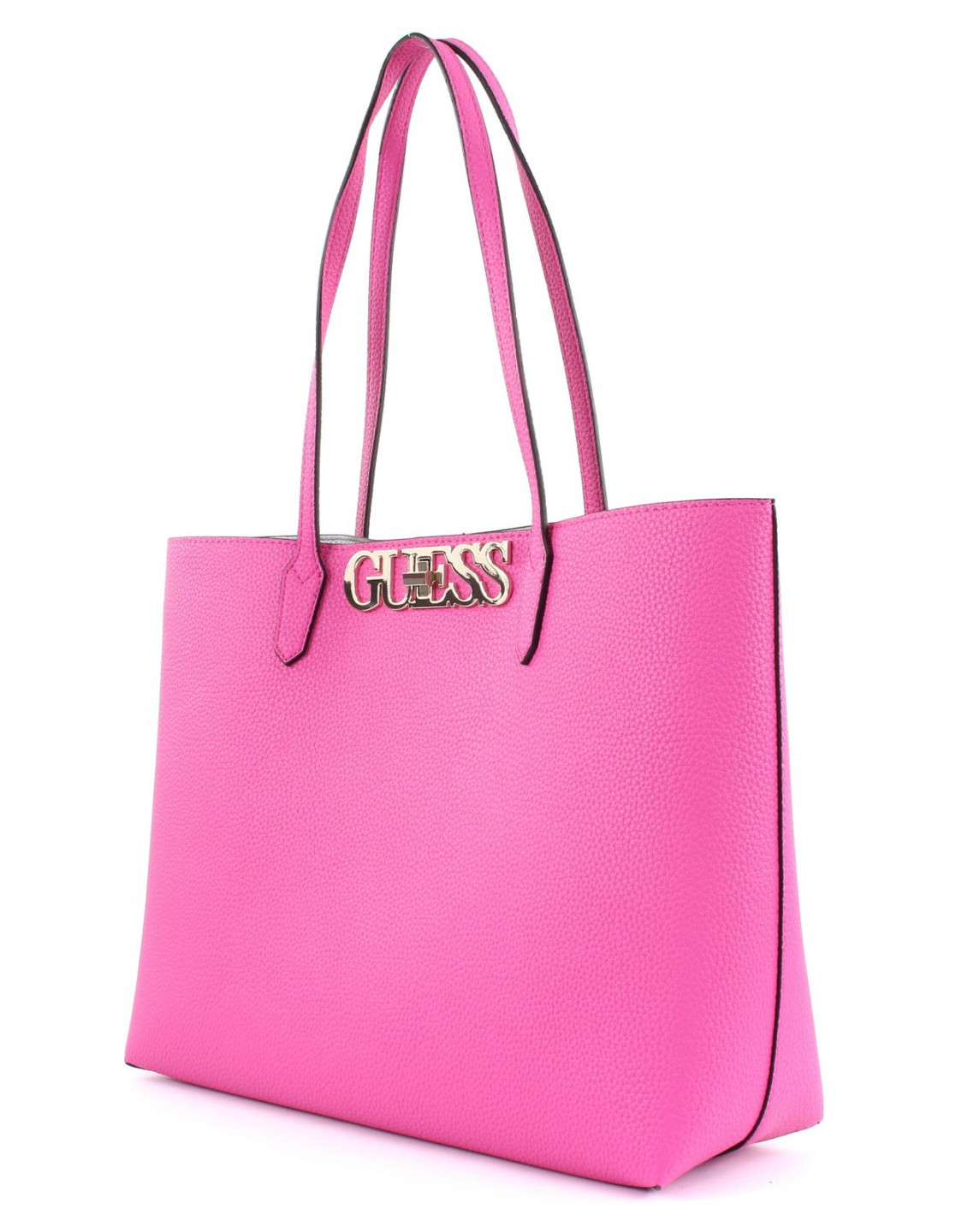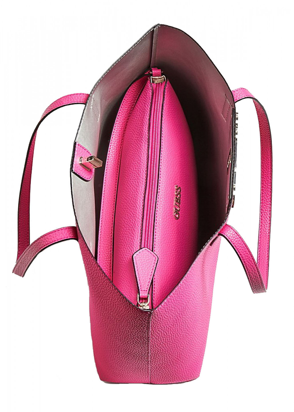 Elegantní růžová kabelka značky GUESS. Uvnitř kabelky se nachází malá kabelka uzavíratelná na zip, kde přední stranu zdobí zlaté kovové logo GUESS.