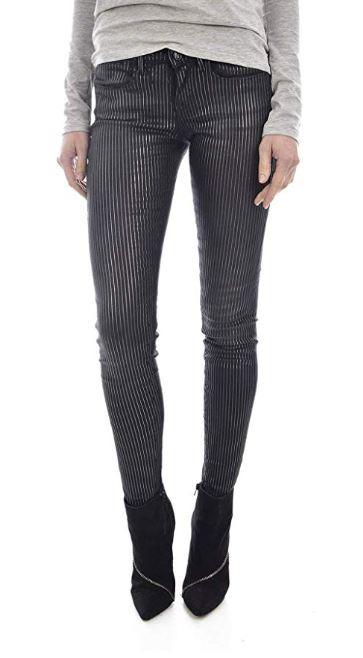 Dámské černé kalhoty s metalickými stříbrnými pruhy. Stylové kalhoty zdobí štítek s logem Guess a kožená aplikace na zadní části pasu.