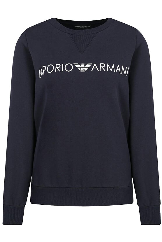 Dámská tmavě modrá mikina značky Emporio Armani. Módní mikina se obléká přes hlavu, zdobí ji na hrudi bílý znak a nápis Emporio Armani. Stylová mikina má v bocích rozparky.