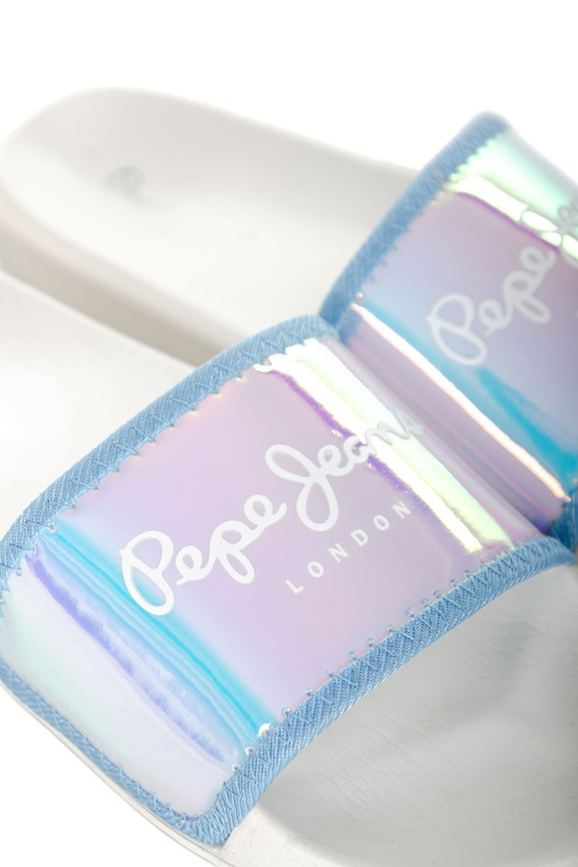 Stylové dámské metalické pantofle Pepe Jeans zdobí nápis Pepe Jeans London.