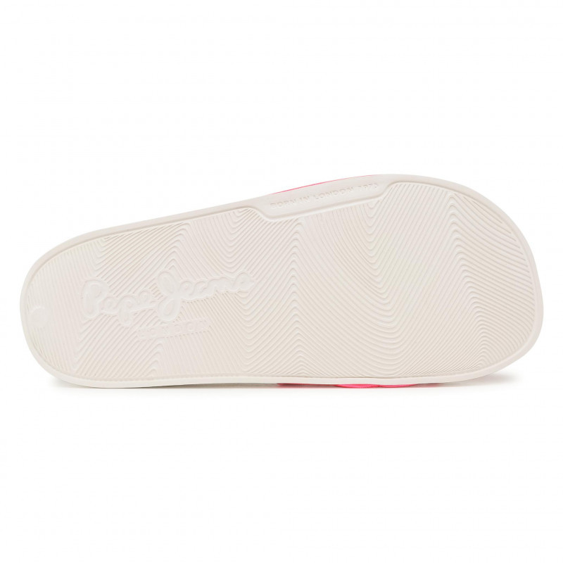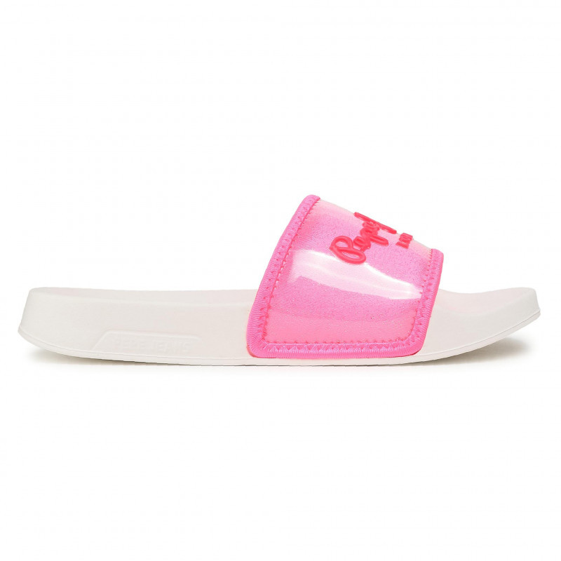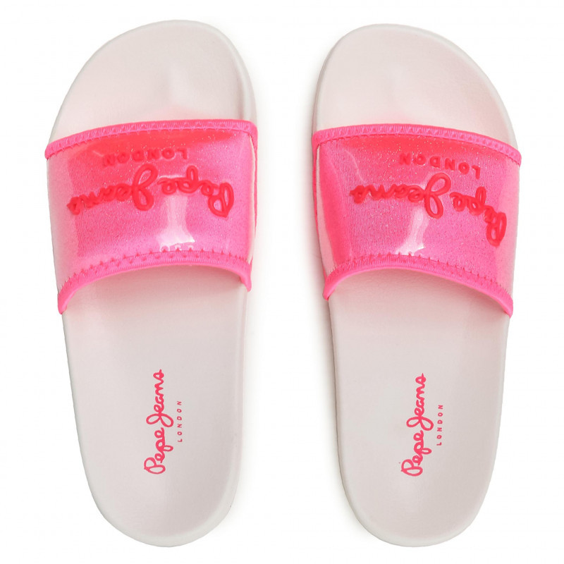 Stylové dámské neonové růžové pantofle Pepe Jeans zdobí nápis Pepe Jeans London.