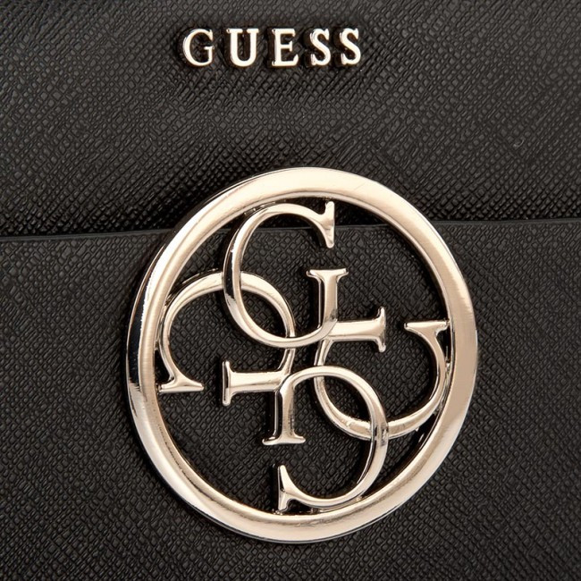 Černá velká peněženka GUESS. Uvnitř se nachází přihrádky na karty, uzavíratelná kapsa na mince a velké kapsy na bankovky. Peněženku zdobí zlaté kování.
