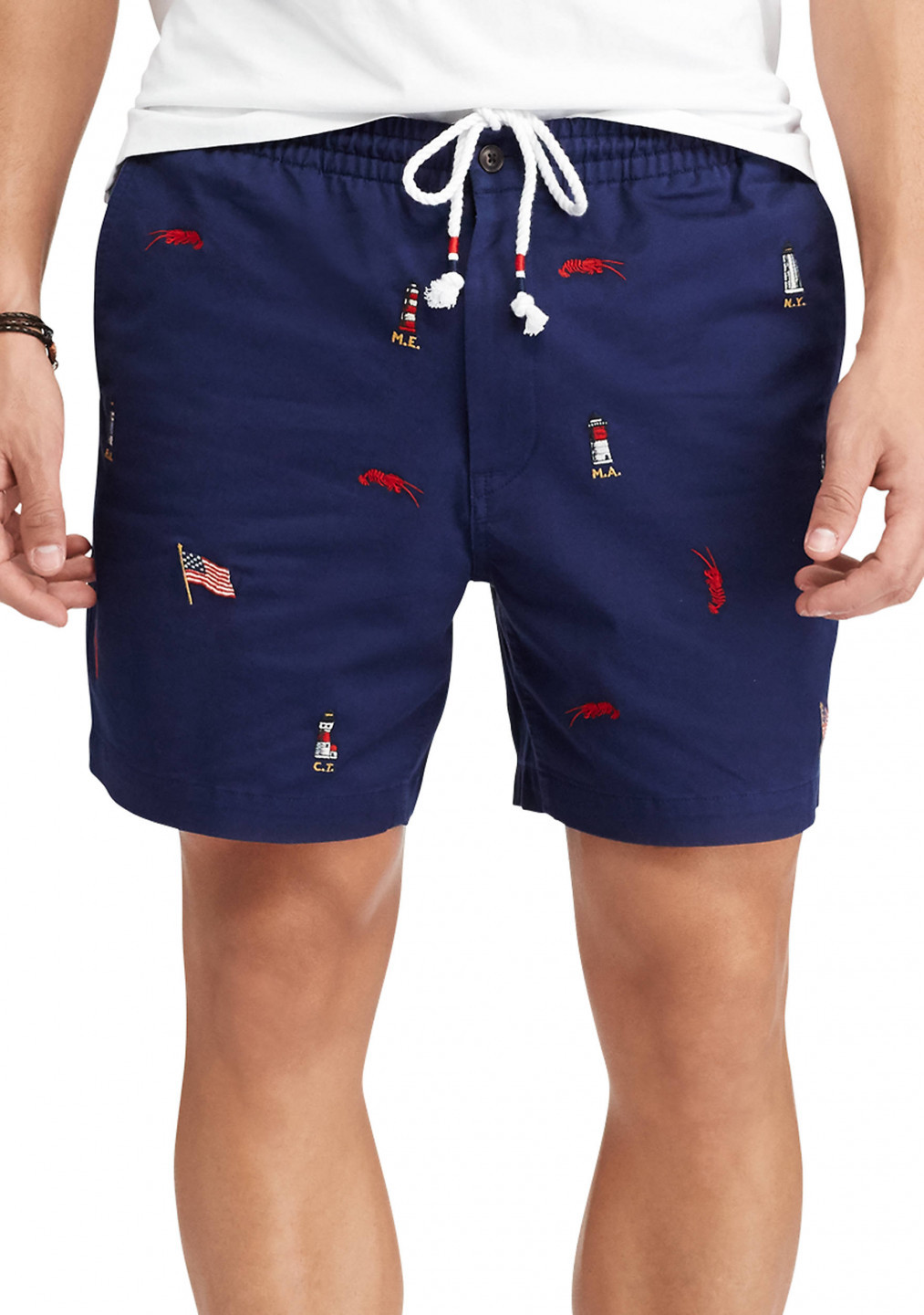 Pánské kraťasy Polo Ralph Lauren tmavě modré s motivem. Motivem na kraťasech je americká vlajka, maják a humr. Kraťasy se zapínají pomocí zipu a knoflíku, mají elastický pas a dají se utáhnout pomocí šňůrek. Na spodní části levé nohavici je zobrazeno POLO logo. Doporučená péče o kraťasy: jemné praní v pračce při 30°C.