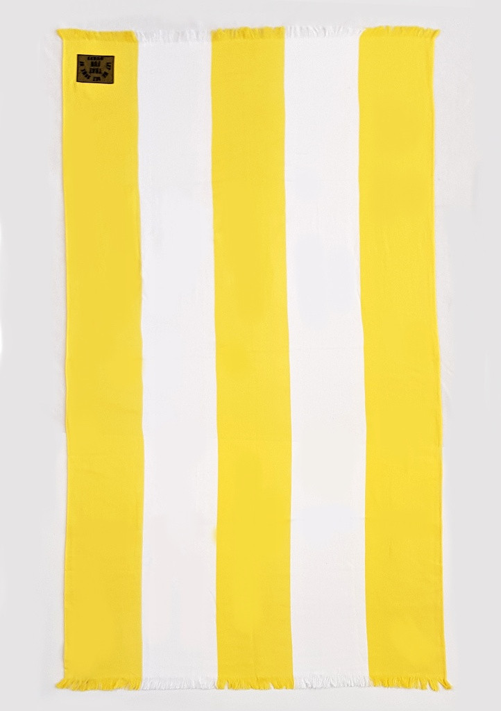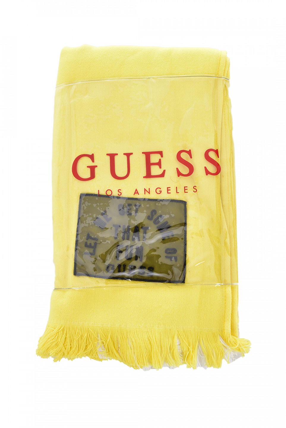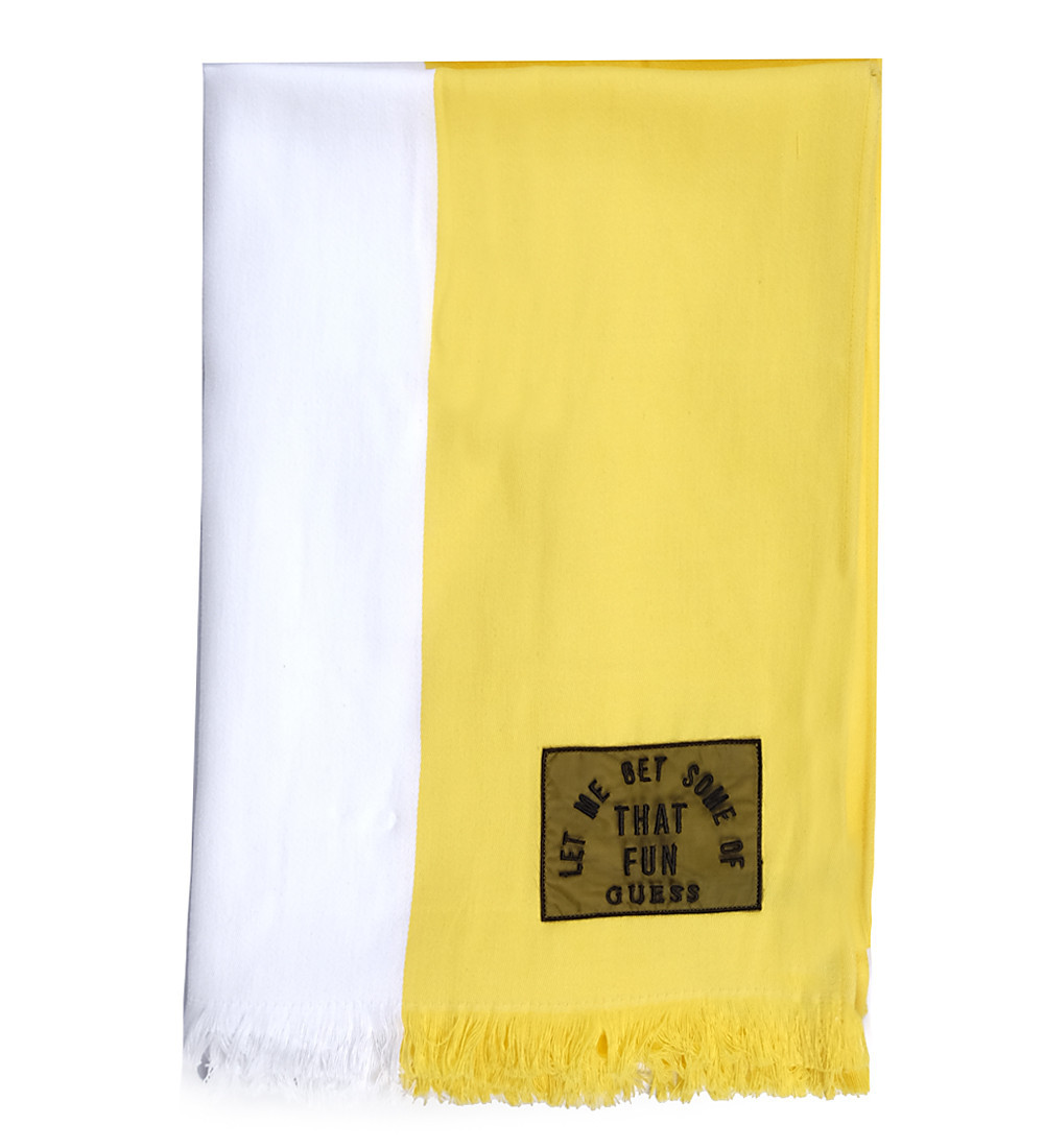 Tenký žluto bílý plážový pléd zdobí černá výšivka s nápisem Guess a střapaté konce.