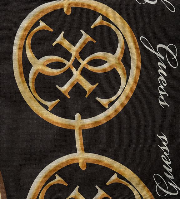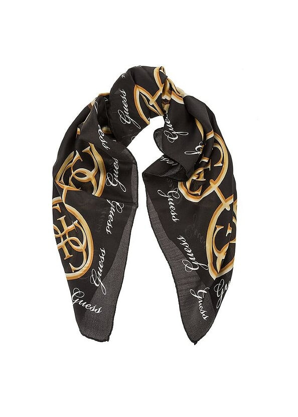 Krásný pevný černý šátek zdobený zlatým logem a bílým nápisem GUESS.