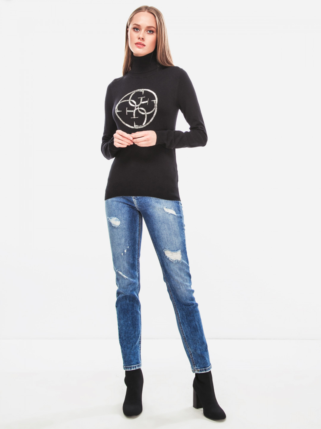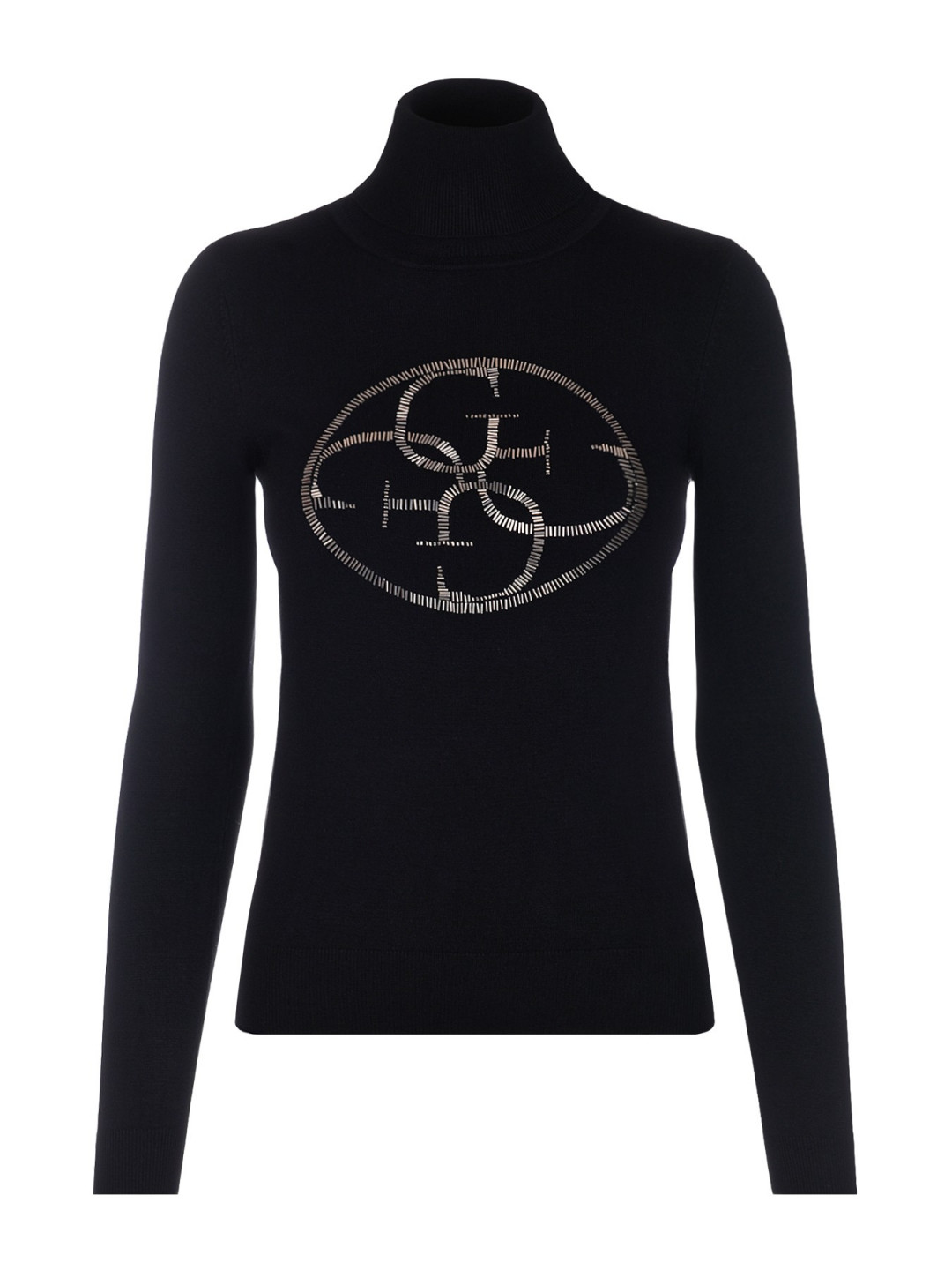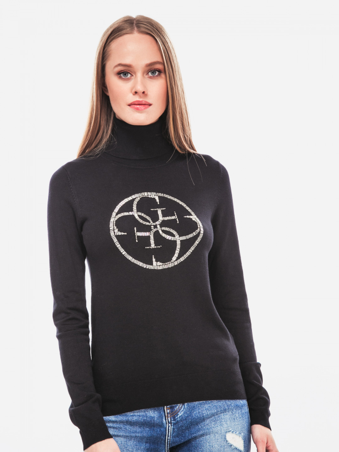 Dámský černý rolák značky GUESS. Stylový rolák zdobí kruhové logo GUESS, které je tvořeno stříbrnými kamínky.