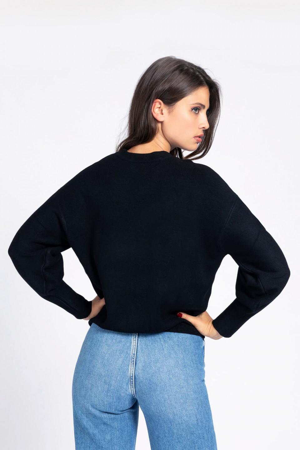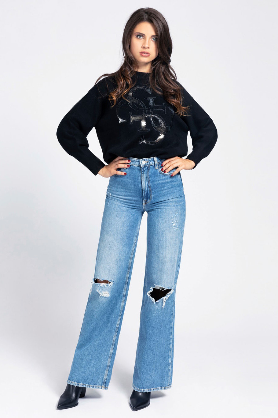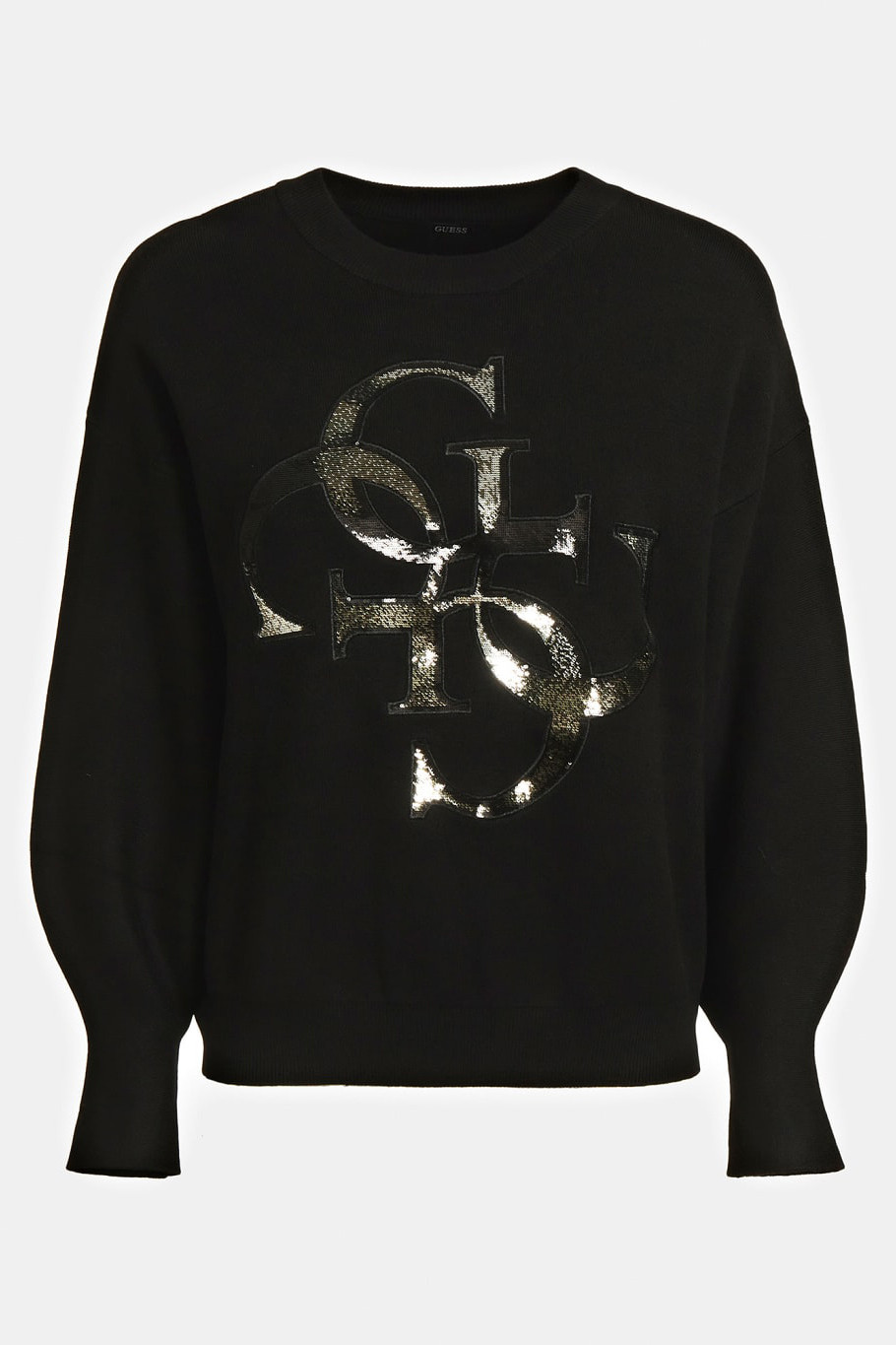 Dámský černý svetr značky GUESS. Stylový svetr volného střihu má lehce rozšířené rukávy a níže posazená ramena. Zdobí ho na celé přední straně překlížená písmena G, které jsou lesklé z flitrů. Svetr je velice pohodlný na nošení.