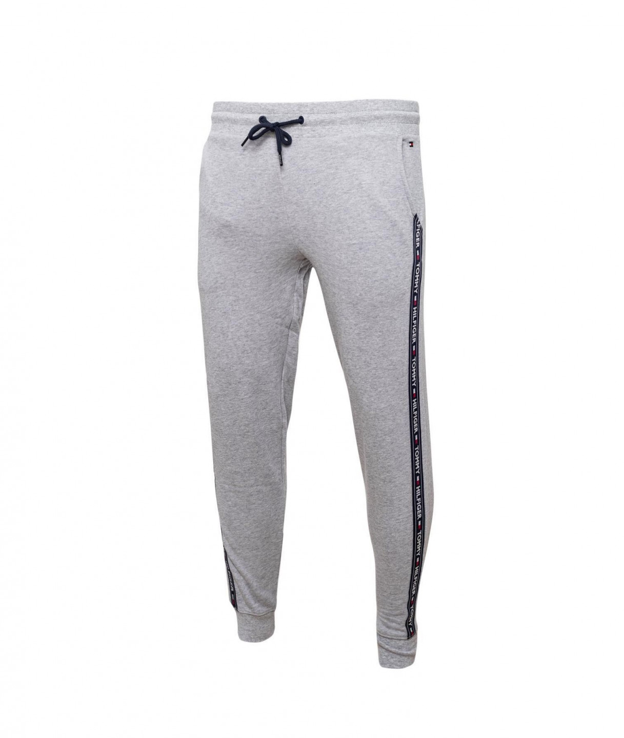 Pánské šedé tepláky značky Tommy Hilfiger. Stylové pánské tepláky mají dvě boční kapsy a jednu zadní. Po stranách jsou podél švu lemované modrým pruhem s nápisem Tommy Hilfiger. Nohavice jsou zúžené, kolem pasu je pružná guma včetně tkaničky. Tepláky jsou velice pohodlné a příjemné na tělo.