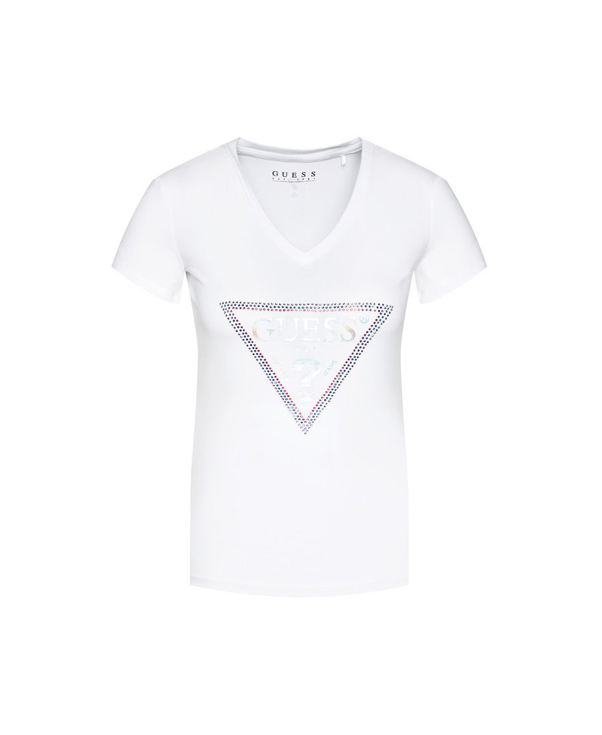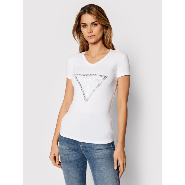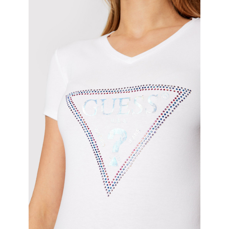 Dámské bílé tričko značky GUESS. Stylové tričko s krátkým rukávem a výstřihem do V. Bavlněné tričko zdobí na hrudi trojúhelník vyskládaný z barevných kamínků a nápis Guess.