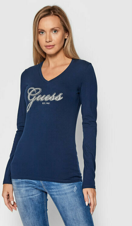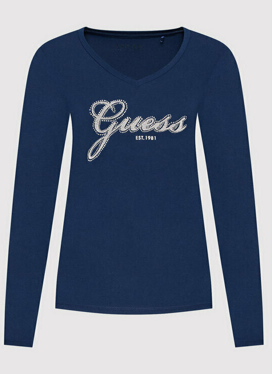 Dámské tmavě modré tričko značky GUESS. Stylové tričko s dlouhým rukávem a výstřihem do V. Tričko zdobí na hrudi  nápis Guess.